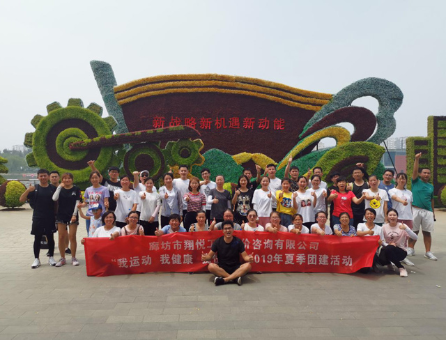 【翔悅大家庭】 七月盛夏,瓦藍(lán)瓦藍(lán)的天空沒(méi)有一絲云彩,火熱的太陽(yáng)炙烤著大地,熱的湖里的魚(yú)不敢露出水面,鳥(niǎo)兒也不敢飛出樹(shù)林,就在這寂靜的時(shí)刻,廊坊市文化藝術(shù)中心迎來(lái)了一群80后90后的爽朗的笑聲、歌聲、加油聲...... 2019年7月13日清晨,公司全體人員齊聚廊坊市文化藝術(shù)中心公園,身著運(yùn)動(dòng)衣運(yùn)動(dòng)鞋的我們已經(jīng)迫不及待的準(zhǔn)備開(kāi)始活動(dòng)啦!